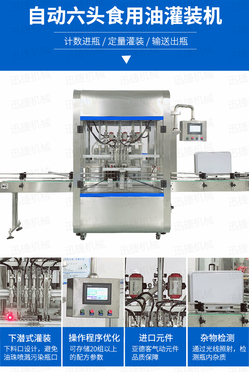 該系列灌裝機采用伺服柱塞式計量灌裝原理,適用于各種規(guī)格(0.1-1升可兼顧到2升灌裝)的南瓜籽油、榛子油、牡丹籽油、芝麻油、核桃油、山茶油、亞麻籽油、棉籽油、橄欖油、大豆油、玉米油、菜籽油等食用油灌裝。設備采用伺服系統(tǒng)定量推料,在人機界面數(shù)字化調節(jié)計量,并且可設定100ml或200ml等所需計量,觸摸屏一觸即達,而且可以單頭微調計量。操作簡單,維護方便,節(jié)省人工成本,生產(chǎn)效率更高。