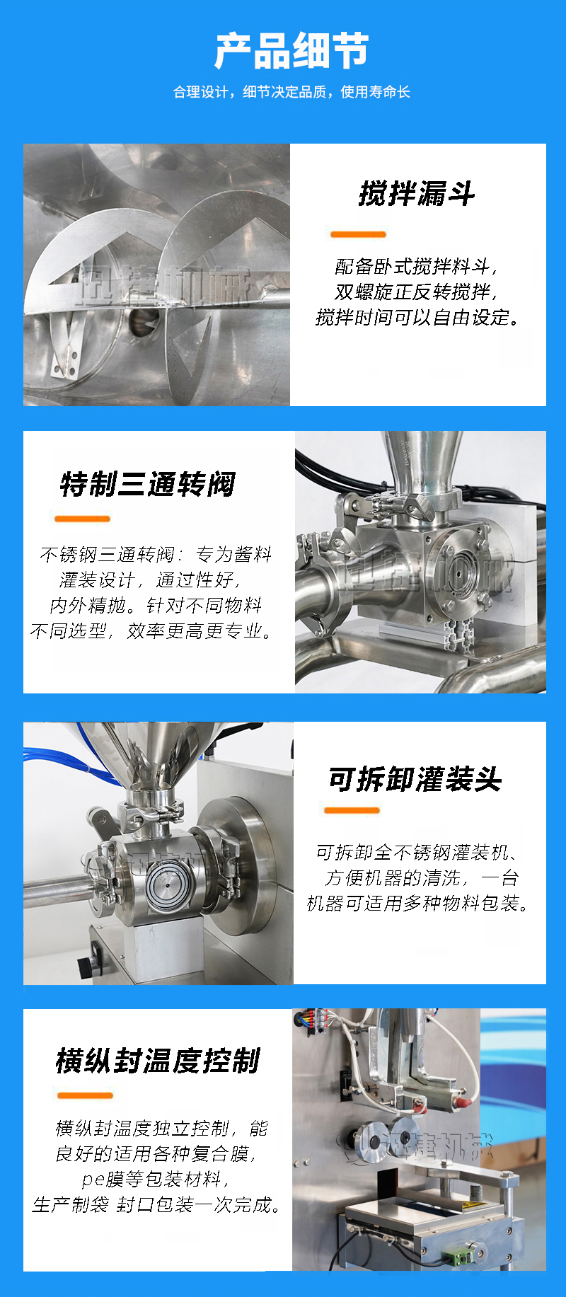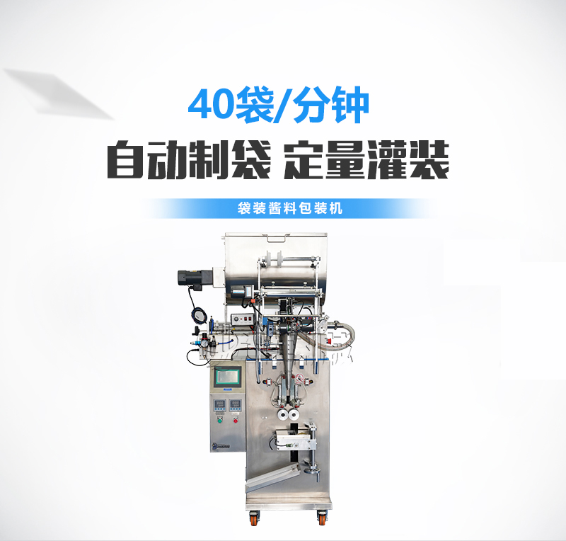 主要用途: DXD-60J醬料包裝機適用于包裝芝麻醬、食用油、洗發液、調味汁、油脂、脂膏、化妝品等產品,將其灌入袋內,能適合各種粘度的產品。該機具有快速、精確、經濟和實用的優點。雙系統設置,可實現醬與油的分流包裝。